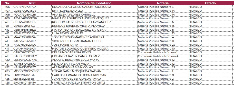 Asimismo, está cancelado el registro del secretario de Turismo, Eduardo Javier Baños Gómez, Corredor Público número 4; la exdiputada federal priista, Lilia Reyes Morales, fedataria número 13; y el titular de la Notaría número 2 de Pachuca, Juan Manuel Sepúlveda Fayad.