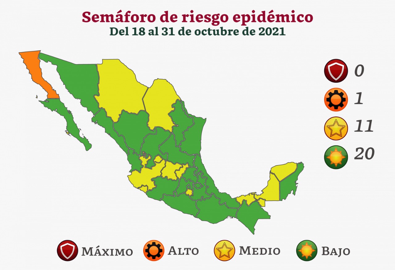 Esta tarde, la Secretaría de Salud federal dio a conocer la actualización del semáforo epidemiológico, en el cual Hidalgo cambia a color verde los próximos 15 días que comprenden del 18 al 31 de octubre, dejando solo a una entidad en color naranja: Baja California Norte.