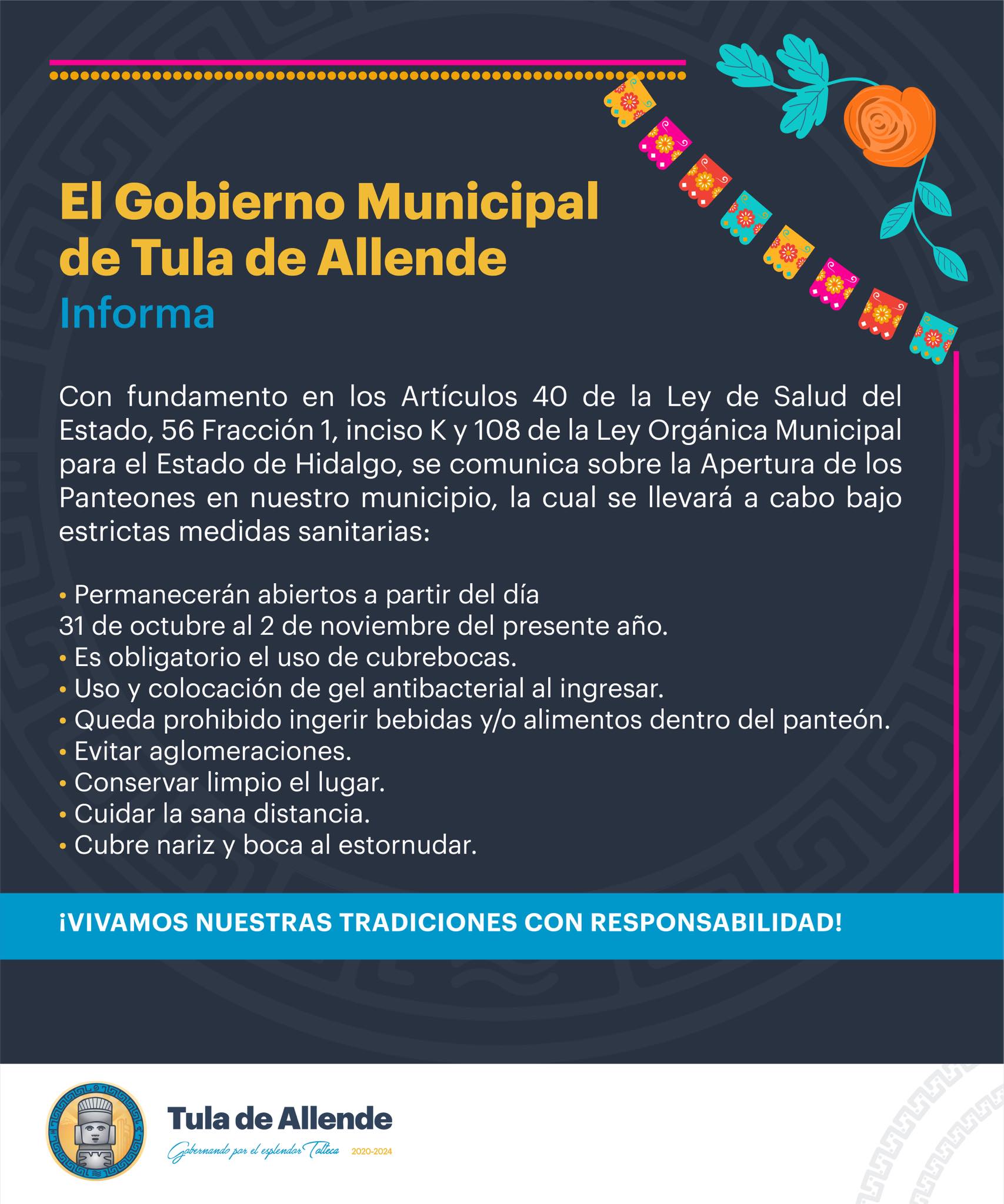 Los panteones del municipio estarán abiertos a toda la población, durante la conmemoración del Día de Muertos, informó la Presidencia Municipal de Tula de Allende.