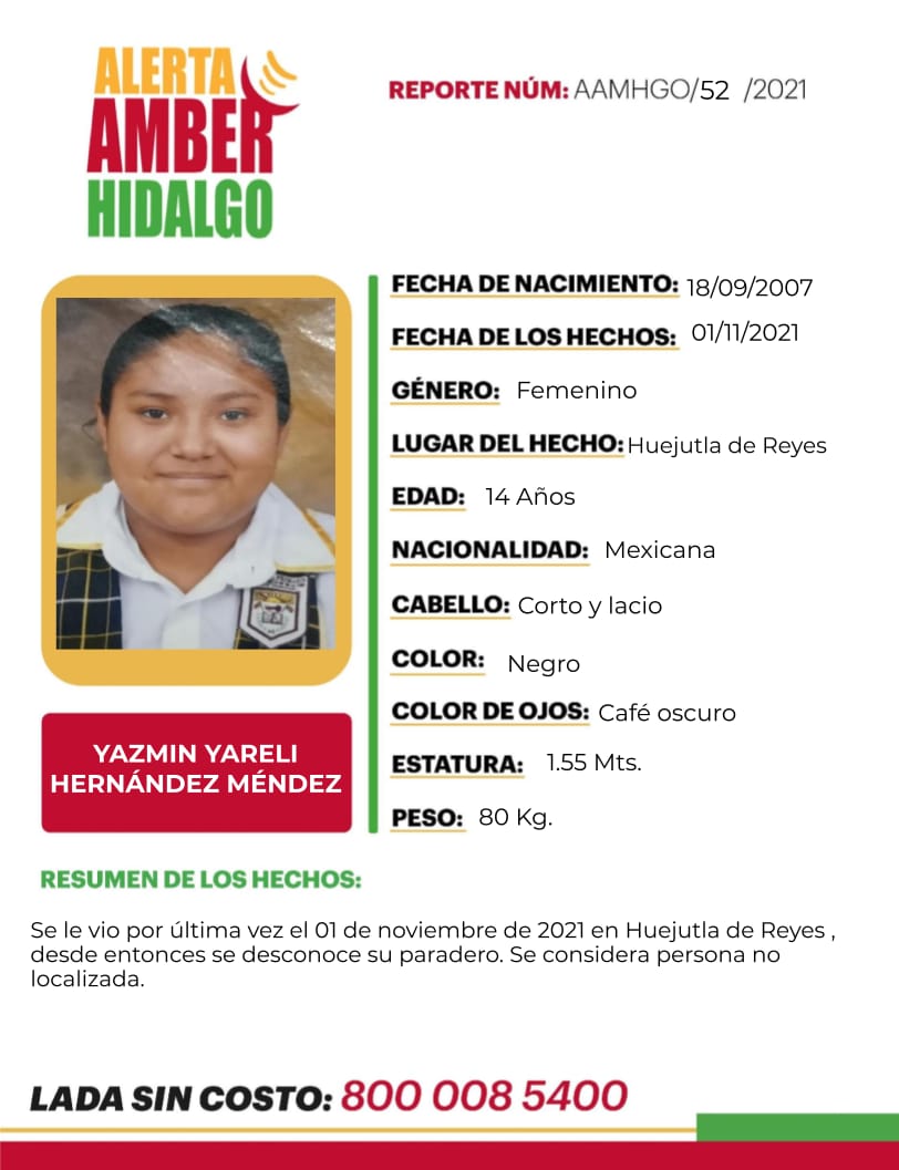 De la misma manera, la Procuraduría General de Justicia del Estado de Hidalgo (PGJEH) solicitó la difusión de una ficha de búsqueda e inició la alerta AMBER para pedir el apoyo de las y los hidalguenses para localizar a esta niña de la que hasta el momento no se sabe dónde o con quién se encuentre.
