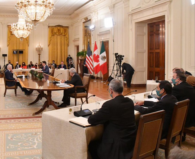 La primera reunión presencial de los mandatarios de México, Estados Unidos y Canadá, se celebró este jueves en la Casa Blanca.