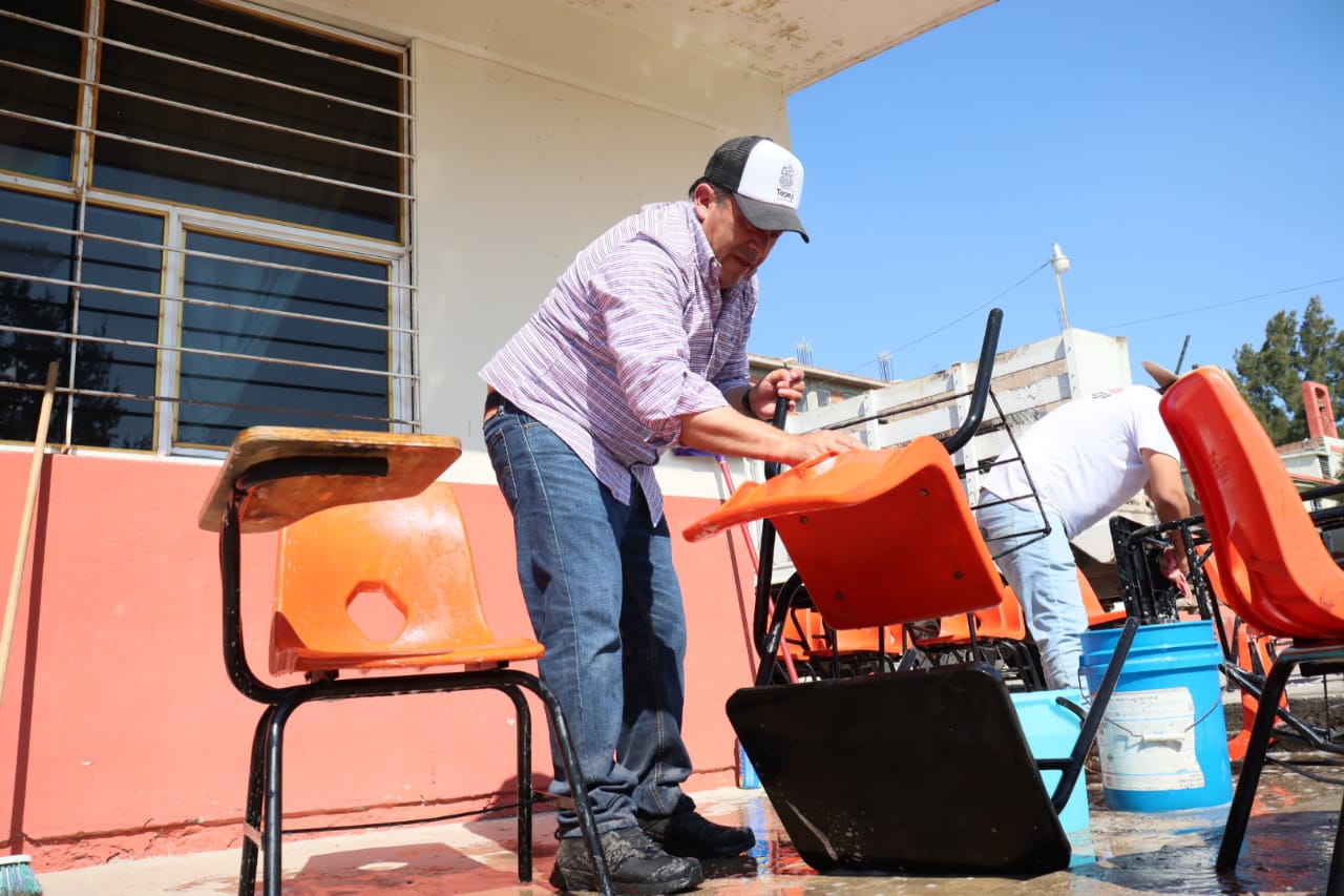Salvador Jiménez de manera solidaria convocó al personal de la administración municipal, llegando al lugar cerca de 80 funcionarios y brigadas de servicios públicos y la Comisión de Agua municipal, para sumarse a los integrantes de la comunidad escolar en los trabajos de limpieza.