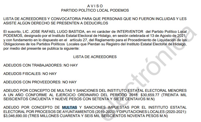 Lo anterior, con base en el aviso publicado en el Periódico Oficial del Estado de Hidalgo (POEH), firmado por José Rafael Lugo Bastida, interventor designado para la liquidación del partido político local.