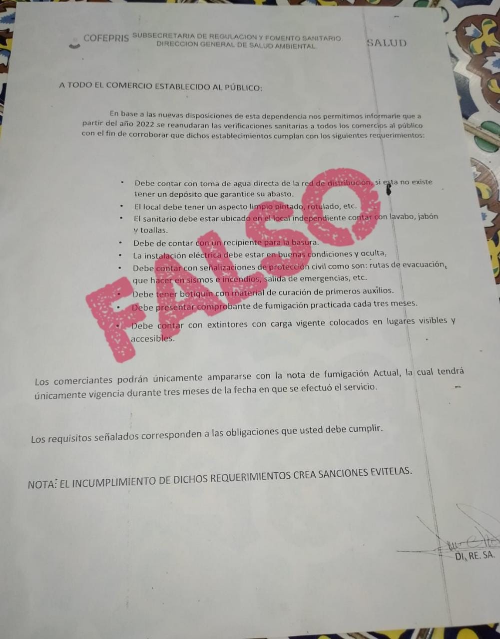 El comunicado señala que ante la inquietud de comerciantes que el día de ayer recibieron un supuesto oficio con membrete de una instancia de la salud, asegurando que pasarán a cobrar multas por no cumplir con ciertas medidas, se verificó su autenticidad con las instancias correspondientes y se constató que esta información es falsa.