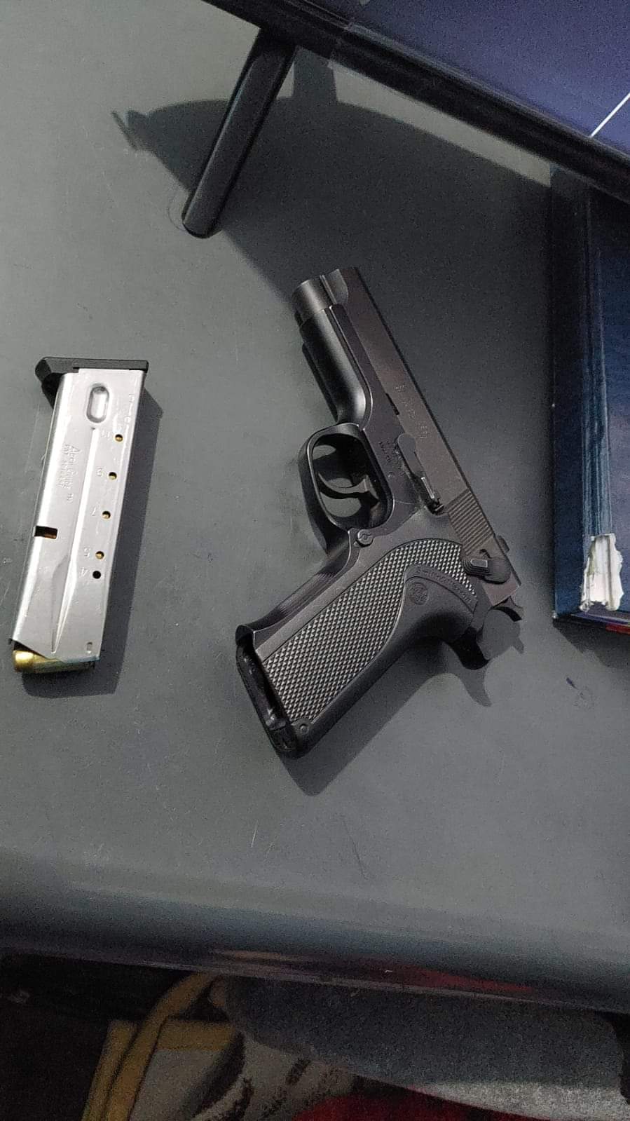 Con apoyo de policías de la Agencia de Seguridad Estatal intervinieron la camioneta y verificaron primero que esta tenía reporte de robo. Luego, tras la inspección de la unidad localizaron un arma de fuego marca Smith/Wesson Springfield abastecida con 11 cartuchos calibre 40 bajo el asiento del copiloto.