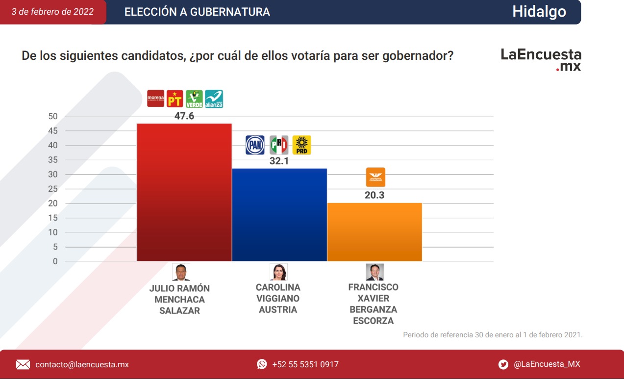 En el careo entre los posibles candidatos, el morenista Julio Menchaca registra 47.6 por ciento de la intención del voto, mientras que la abanderada de “Va por Hidalgo”, Carolina Viggiano, registra 32.1 por ciento del voto, por lo que según LaEncuesta.MX esta candidatura no logra mantener el apoyo hacía la alianza con lo que aumenta a 15.5 puntos la diferencia con el primer lugar.