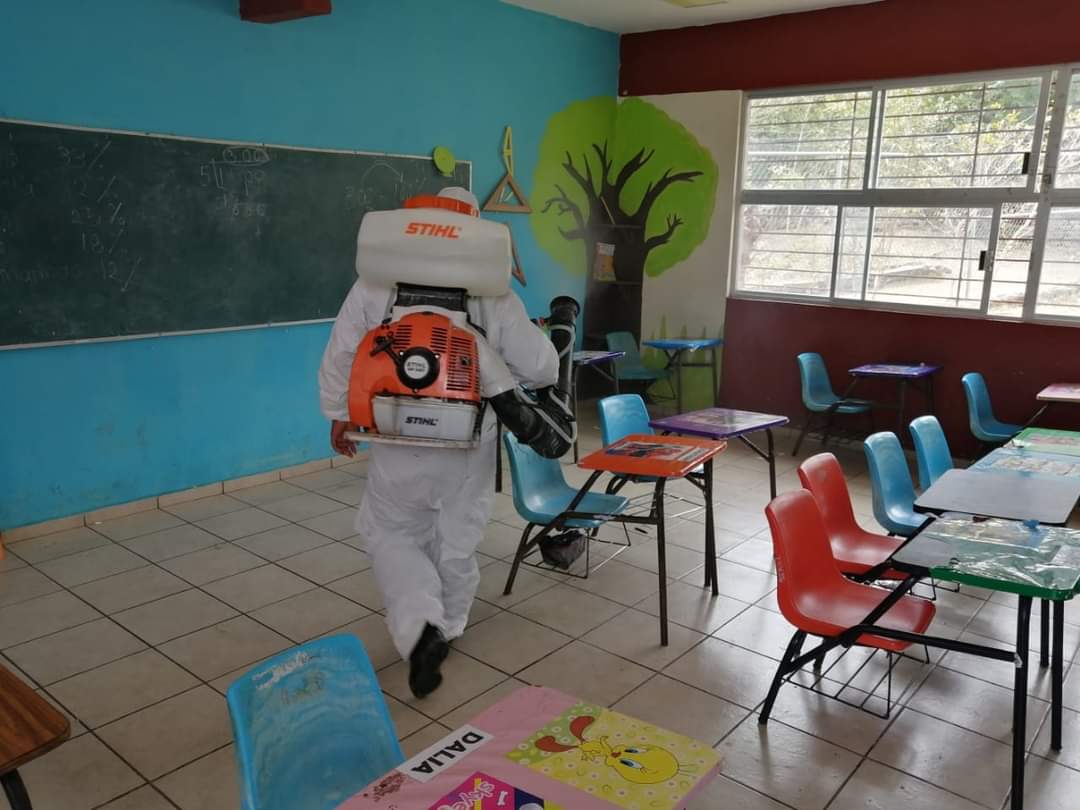 Como parte de las acciones que se llevan a cabo, se realiza la dispersión de desinfectante en cada una de las áreas que integran los centros educativos, los cuales se han calendarizado con base en las solicitudes que en su momento hicieron llegar a la administración municipal.
