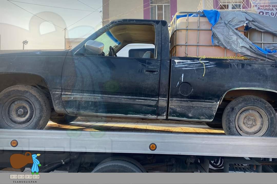 Se trata de una camioneta Chevrolet Silverado sin placas de circulación color negra, la cual cuenta con reporte de robo, que en su área de carga traía dos contenedores de plástico con capacidad de mil litros abastecidos ambos al 85%.
