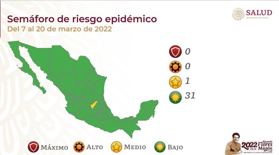 La Secretaría de Salud federal, dio a conocer la actualización del semáforo epidemiológico, que comprenderá del 7 al 20 de marzo; en la cual coloca a Hidalgo en color verde junto con 30 entidades más, dejando solo a una entidad federativa en color amarillo: Querétaro.