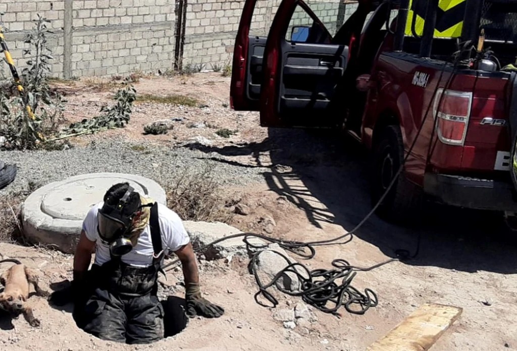 Tras arribar al sitio del incidente, los elementos de la agrupación estatal ingresaron al registro del dren de agua residual de más de tres metros de profundidad mediante equipo y sistema de rapel, de donde pudieron sacar con sano y salvo al perrito y reunirlo con su dueño.