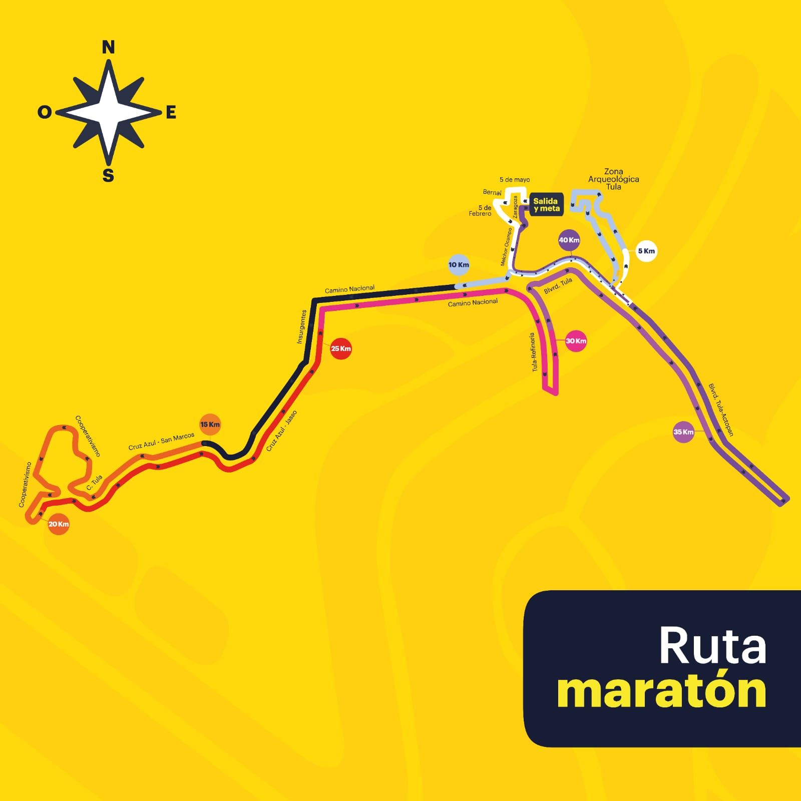 toman la carretera Tula-Refinería a la altura del Conchal, retornan para dirigirse al bulevar Tula-Iturbe a la altura de Teocalco, donde está el arco detector del estado, retornan de nuevo al entronque de calzada Melchor Ocampo, regresan a avenida Zaragoza, hasta el punto de salida donde está la meta.