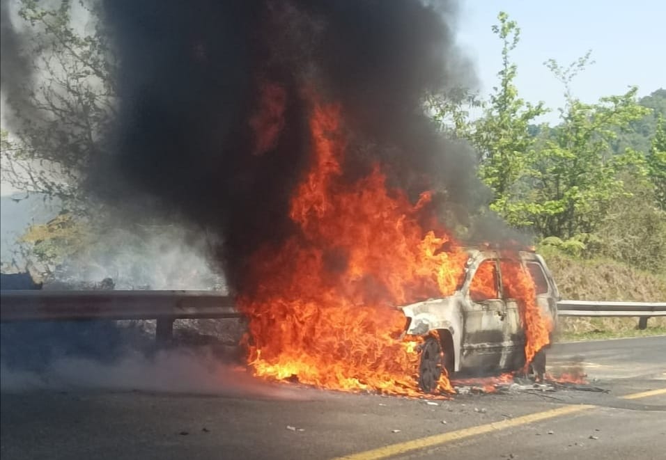 Huejutla, Hidalgo a 30 de marzo del 2022.- Sin causa aparente, una camioneta Jeep en la que viajaba una familia se incendió cuando transitaba por la carretera federal México – Tampico, en inmediaciones de la zona conocida como “La Virgencita“.