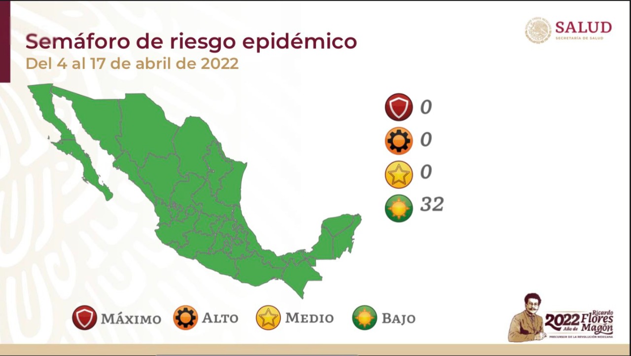 La Secretaría de Salud federal dio a conocer la noche del 1 de abril la actualización del semáforo epidemiológico, que comprenderá los próximos 15 días, es decir, del 4 al 17 de abril y que coloca a todo el país en color verde, es decir, nivel de riesgo bajo.