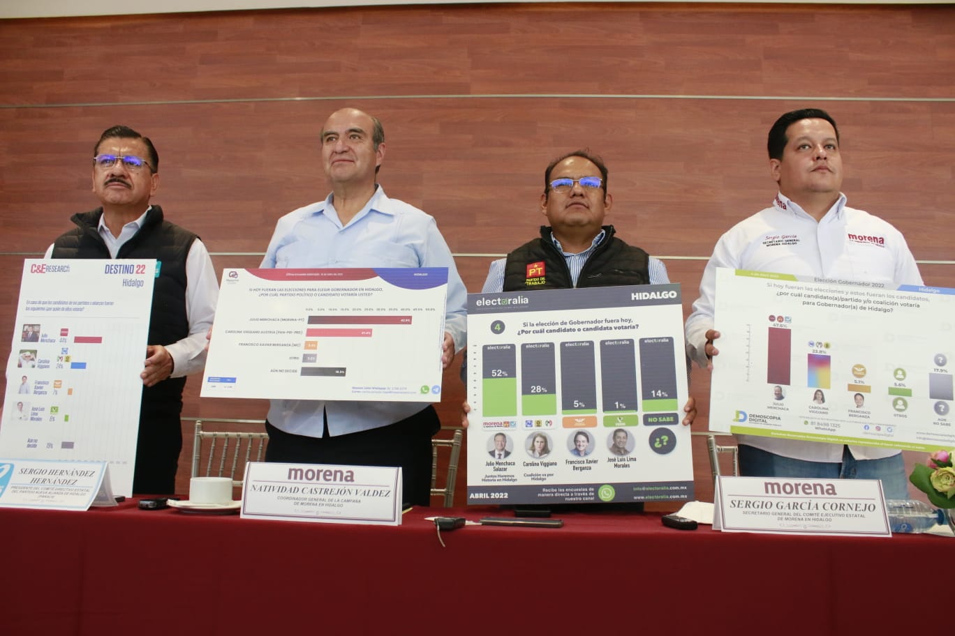 Durante una rueda de prensa, que se llevó a cabo en las instalaciones del Hotel Emily, en el Centro de Pachuca, en la que estuvieron presentes el Secretario General del Comité Ejecutivo de Morena en Hidalgo, Sergio García, así como del representante del Partido del Trabajo (PT), Javier Vázquez Calixto, y el presidente de Nueva Alianza Hidalgo (NAH), Sergio García Hernández; el doctor Natividad Castrejón enfatizó que conforme avance la campaña, los datos estadísticos seguirán aumentando en favor de Menchaca Salazar.