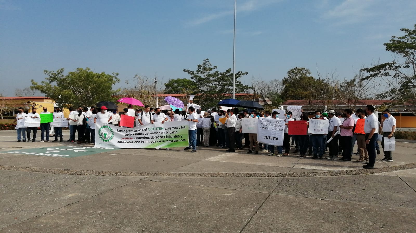 Huejutla, Hidalgo a 11 de abril del 2022.- Trabajadores afiliados al Sindicato Único de Trabajadores de las Universidades Tecnológicas en el Estado de Hidalgo (SUTUTEH), protestaron en la Universidad Tecnológica de la Huasteca Hidalguense (UTHH), para exigir que les entreguen la toma de nota que los reconozca como gremio.