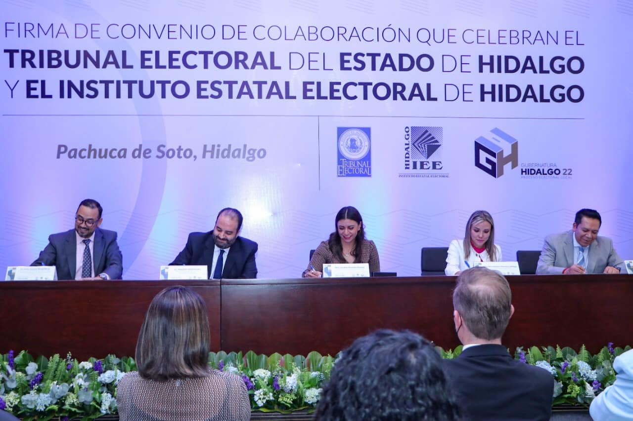 El día de ayer, el Instituto Estatal Electoral de Hidalgo (IEEH) firmó un Convenio de Colaboración con el Tribunal Electoral del Estado de Hidalgo (TEEH) con el objetivo de mejorar la eficiencia en el tratamiento de los Procedimientos Especiales Sancionadores derivados del actual Proceso Electoral en el que se renovará la Gubernatura Hidalgo 2022.