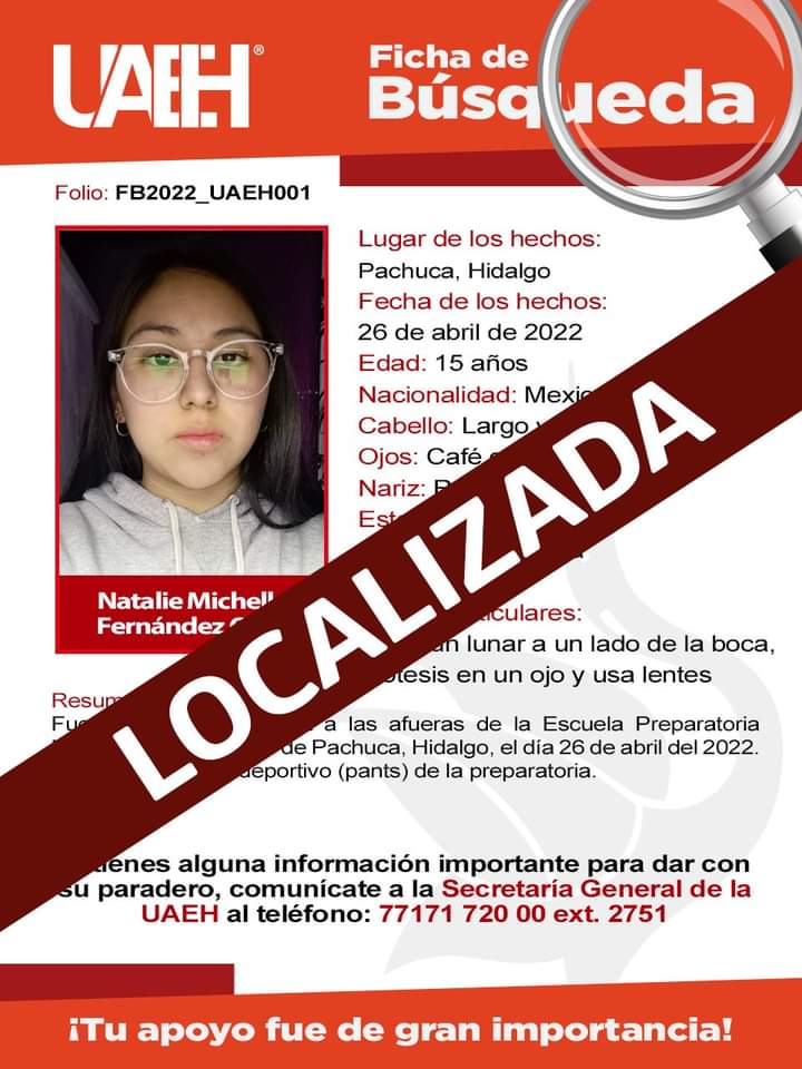 La Secretaría de Seguridad Pública de Hidalgo (SSPH) notificó esta tarde, la localización de Natalie Michelle Fernández Ortiz, la joven de 15 años que fue reportada como desaparecida el pasado martes 26 de abril del presente año, en el municipio de Pachuca de Soto.
