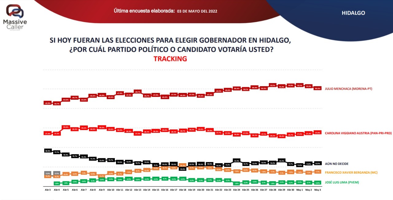Según el tracking de Massive Caller, el candidato común de Juntos Hacemos Historia (Morena, PT y Nuevo Alianza Hidalgo), Julio Menchaca Salazar, inició su campaña proselitista con una intención del voto de 42.9 por ciento, la cual un mes después aumentó a 50.5 puntos porcentuales, con lo que se mantiene a la cabeza de las preferencias para la renovación del Ejecutivo.