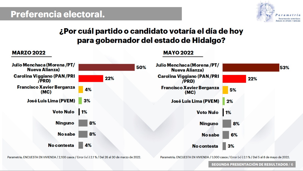 Mientras que Carolina Viggiano Austria, candidata de la alianza “Va por Hidalgo”, integrada por el PRI, PAN y PRD, no registró variación y se mantuvo en el 22 por ciento de las preferencias electorales, por lo que la diferencia entre el primer y segundo lugar se incrementó de 28 a 31 puntos porcentuales.