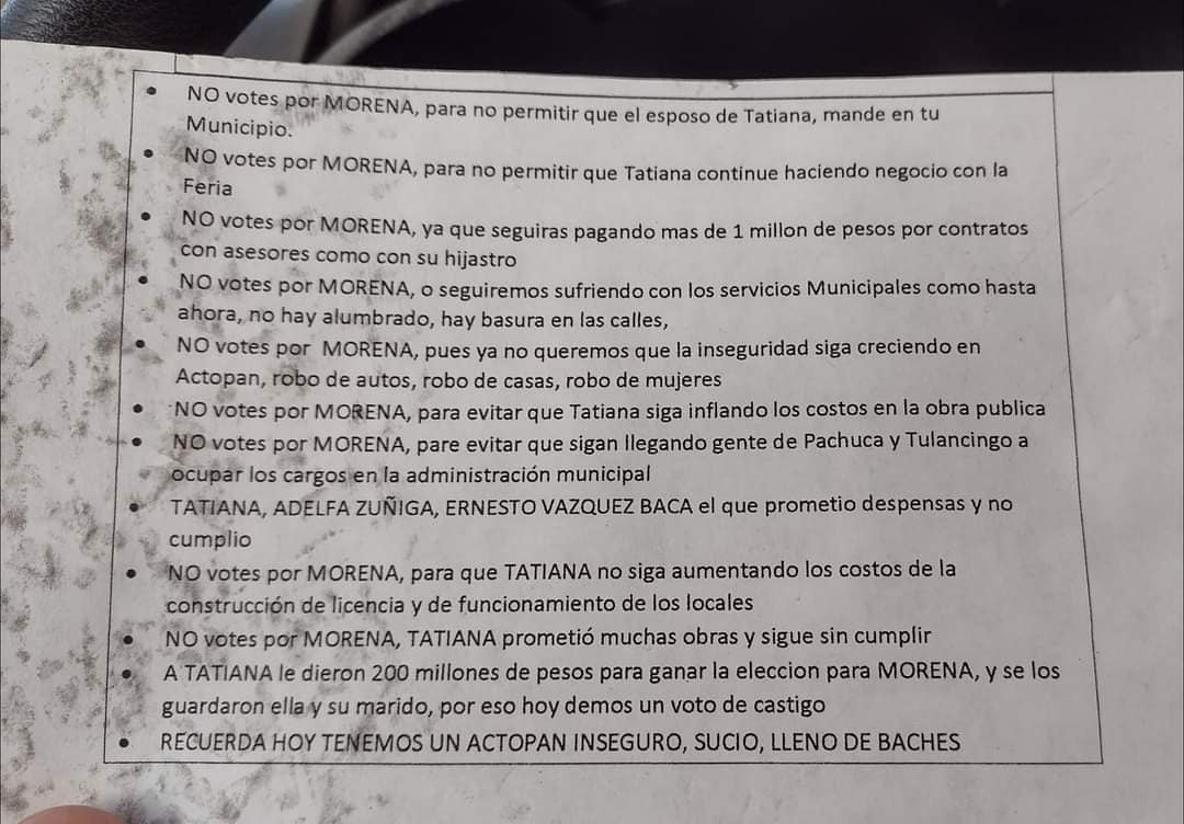Esta mañana, previo a la apertura de las casillas electorales para la renovación de la gubernatura, en las calles de Actopan aparecieron unos panfletos en contra de la presidenta municipal, Tatiana Ángeles Moreno, y de su partido el Movimiento de Regeneración Nacional (Morena), en los que llaman a darle un voto de castigo a la alcaldesa.