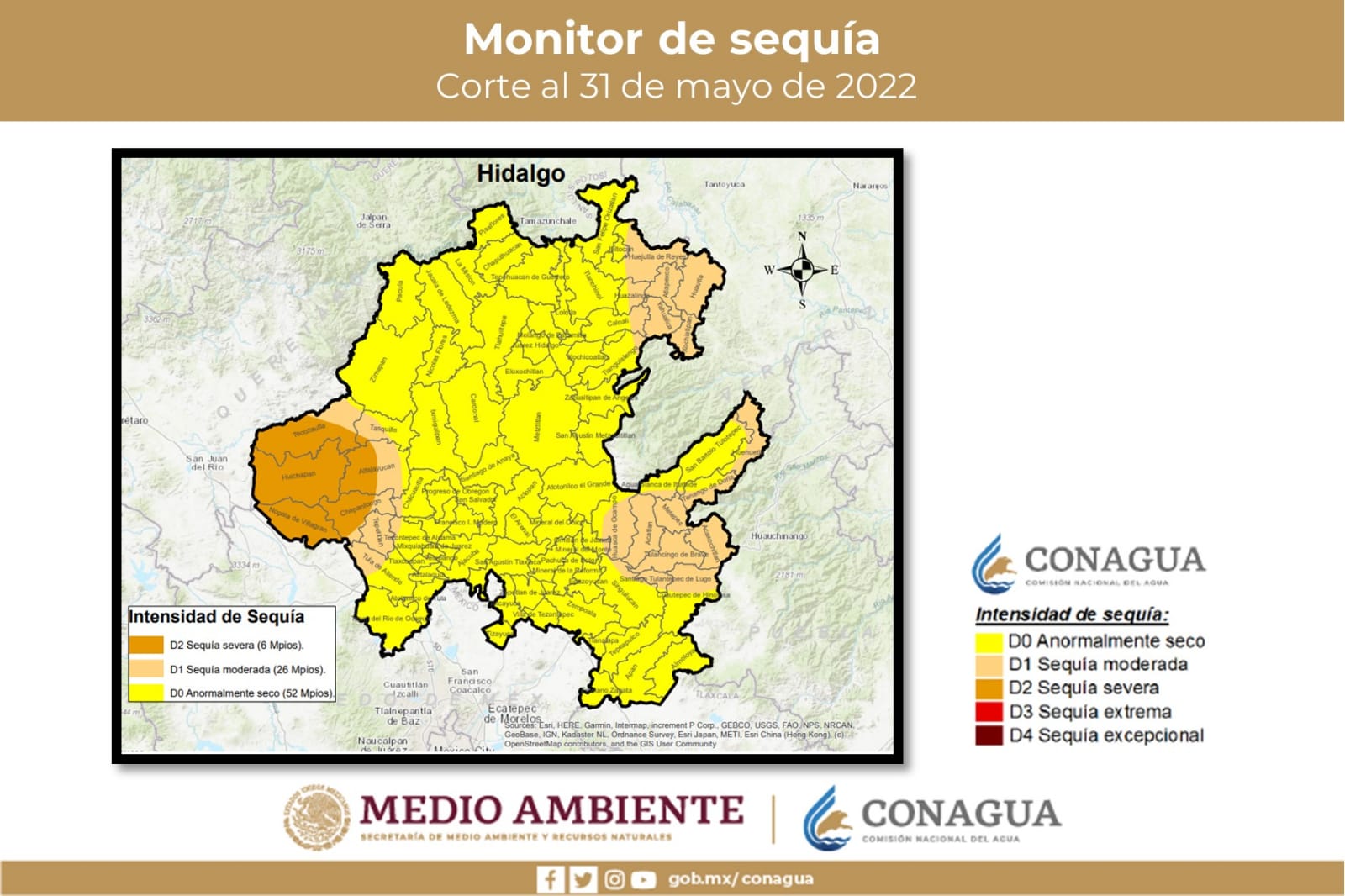 De acuerdo con el Monitor de Sequía de la Dirección Local Hidalgo de la Comisión Nacional del Agua (Conagua), con corte al 31 de mayo de 2022, se indica que seis municipios reportan sequía severa, 26 sequía moderada y 52 demarcaciones se encuentran en condiciones anormalmente secas.