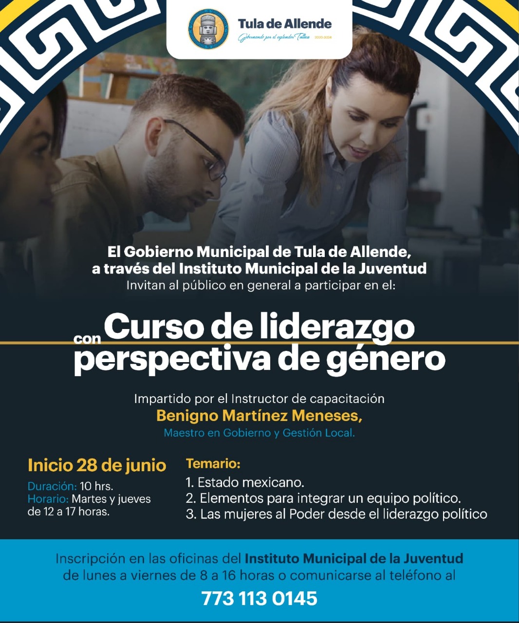El gobierno municipal de Tula de Allende, a través del Instituto Municipal de la Juventud (IMJ), invitan al público en general al curso gratuito de Liderazgo con Perspectiva de Género en el que se abordarán los temas: Estado Mexicano, Elementos para Integrar un Equipo Político y Las Mujeres al Poder desde el Liderazgo Político.