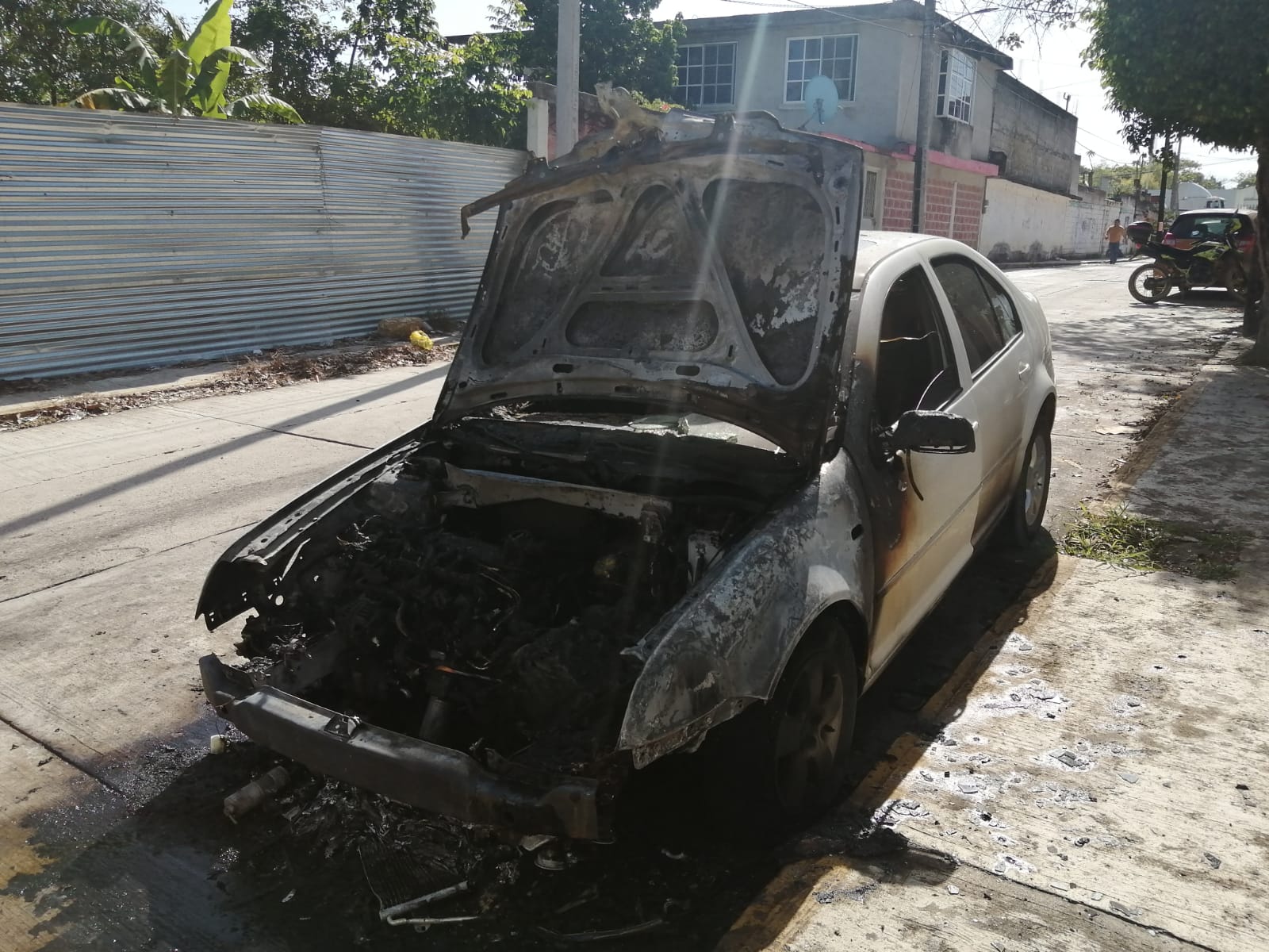 Todo indica que fue un corto circuito en el sistema eléctrico del automóvil Volkswagen Jetta, color blanco lo que ocasionó el siniestro que, afortunadamente, no reporta lesionados.