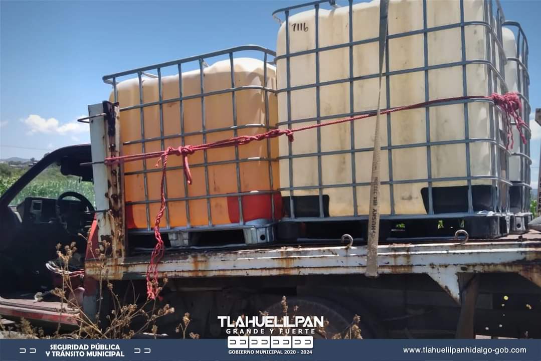Al revisar el estatus de la unidad encontraron que cuenta con reporte de robo vigente, por lo que la aseguraron y pusieron a disposición de la Procuraduría General de la República con sede en Tula de Allende, junto con 4 contenedores de mil litros uno de ellos al 90% de su capacidad y uno al 40% con líquido de las características propias del hidrocarburo y dos más vacíos.