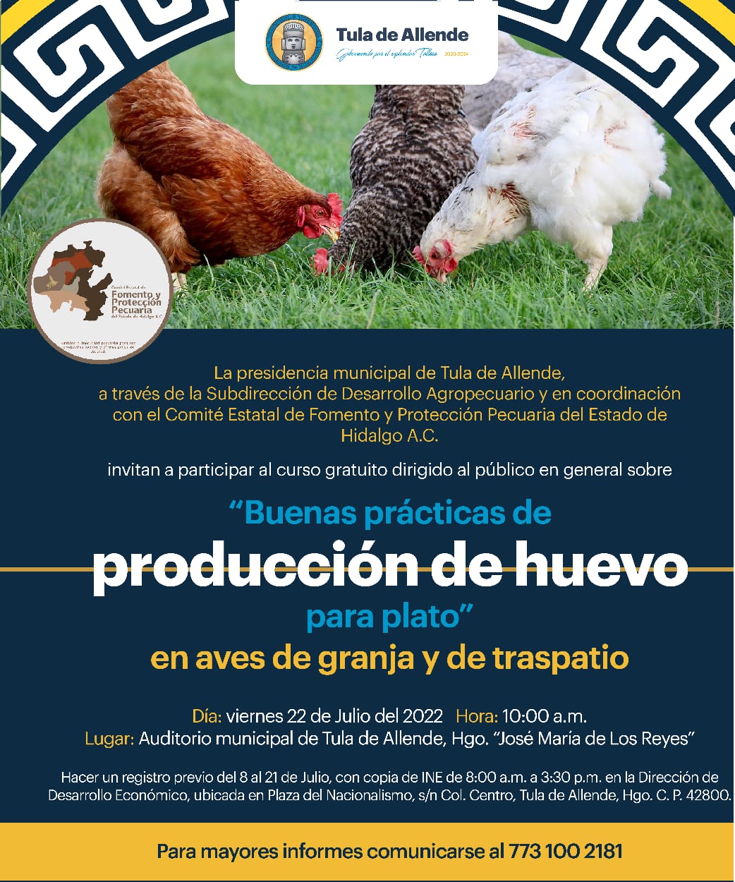 La presidencia municipal de Tula de Allende invita a los ciudadanos a participar en el curso “Buenas prácticas de producción de huevo para plato” en aves de granja y de traspatio.
