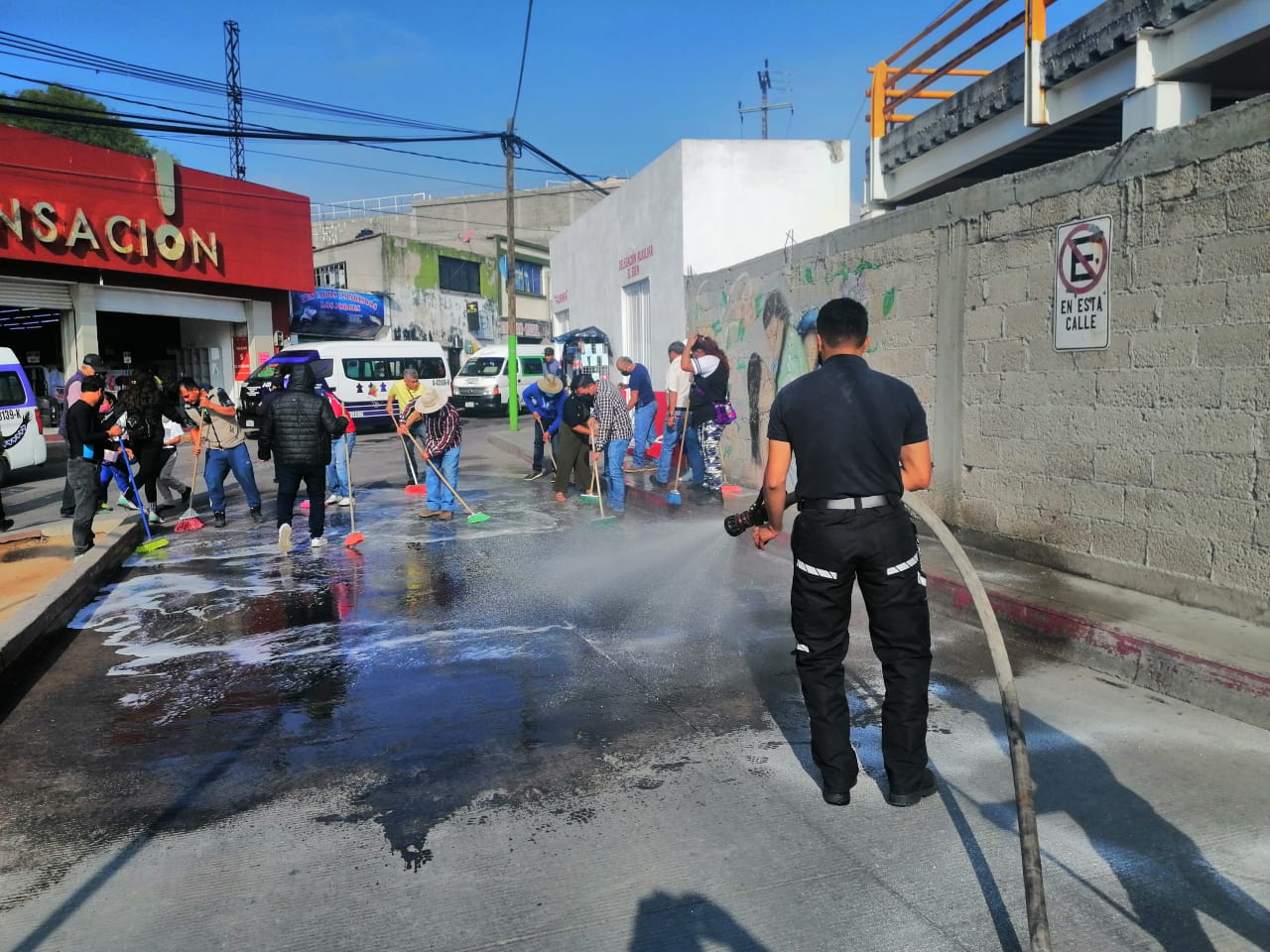 Este miércoles se llevaron a cabo la limpieza y lavado de la calle Gardenia y el área conocida como la Zanja, en donde se coloca el comercio del Tianguis de los Lunes.