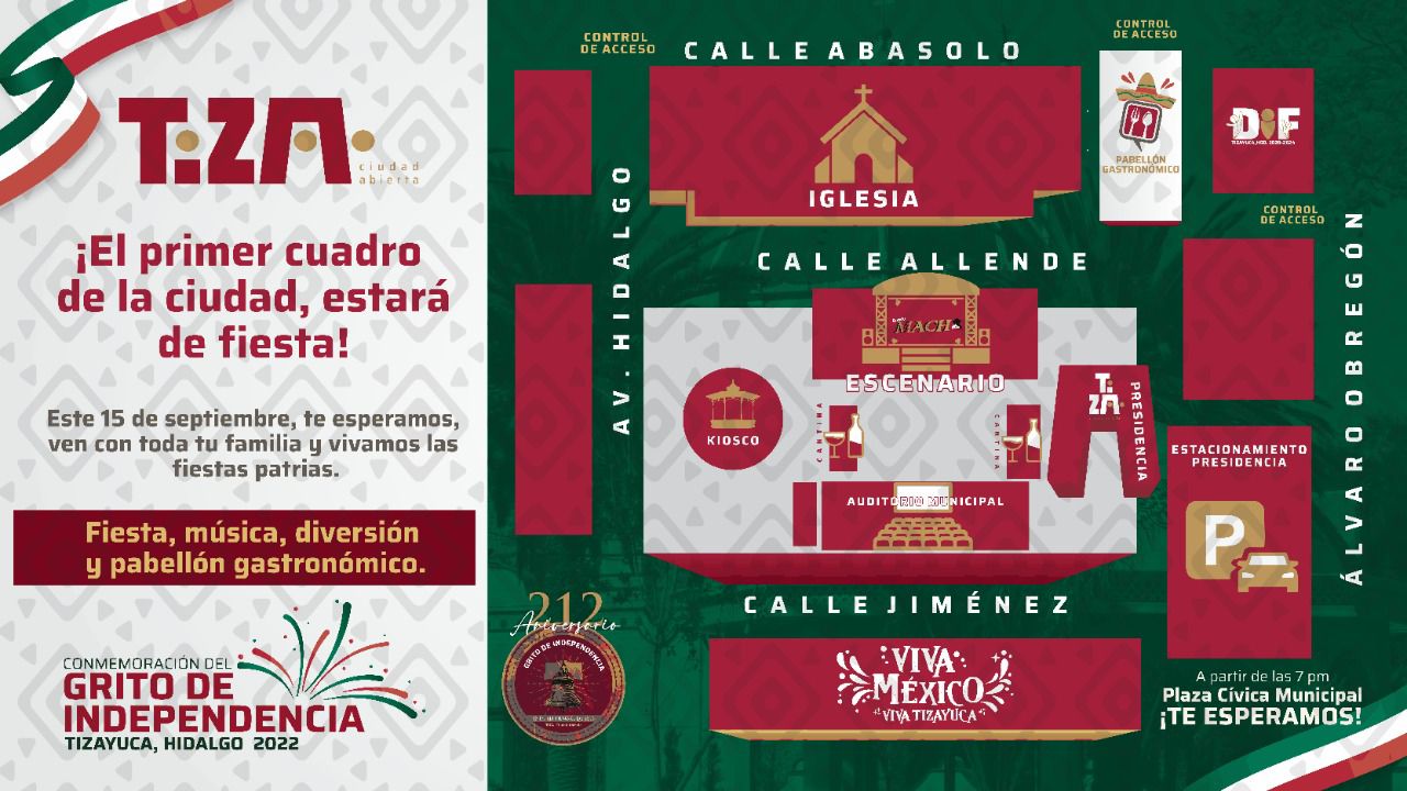 Con motivo de la conmemoración del CCXII aniversario del Grito de Independencia, el gobierno municipal de Tizayuca, informa a la ciudadanía de los cierres vehiculares que habrá el próximo 15 de septiembre, de la calle Allende hasta su entronque con la calle de 5 de mayo y Álvaro Obregón, además de avenida Hidalgo y calle Ignacio Rodríguez Galván en su entronque con la avenida Juárez, así como la prolongación de la avenida Hidalgo con calle Emiliano Zapata y cierre de la calle Jiménez.