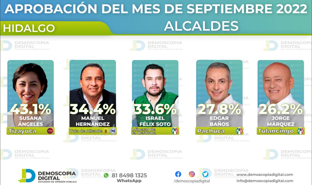 La encuestadora Demoscopia Digital realizó un estudio de opinión pública con el que evaluó la aprobación de 188 presidentes municipales del país, cinco de ellos de Hidalgo, entre quienes resalta la alcaldesa de Tizayuca, Susana Ángeles Quezada, cuyo gobierno es avalado por el 43.1 por ciento de los ciudadanos.