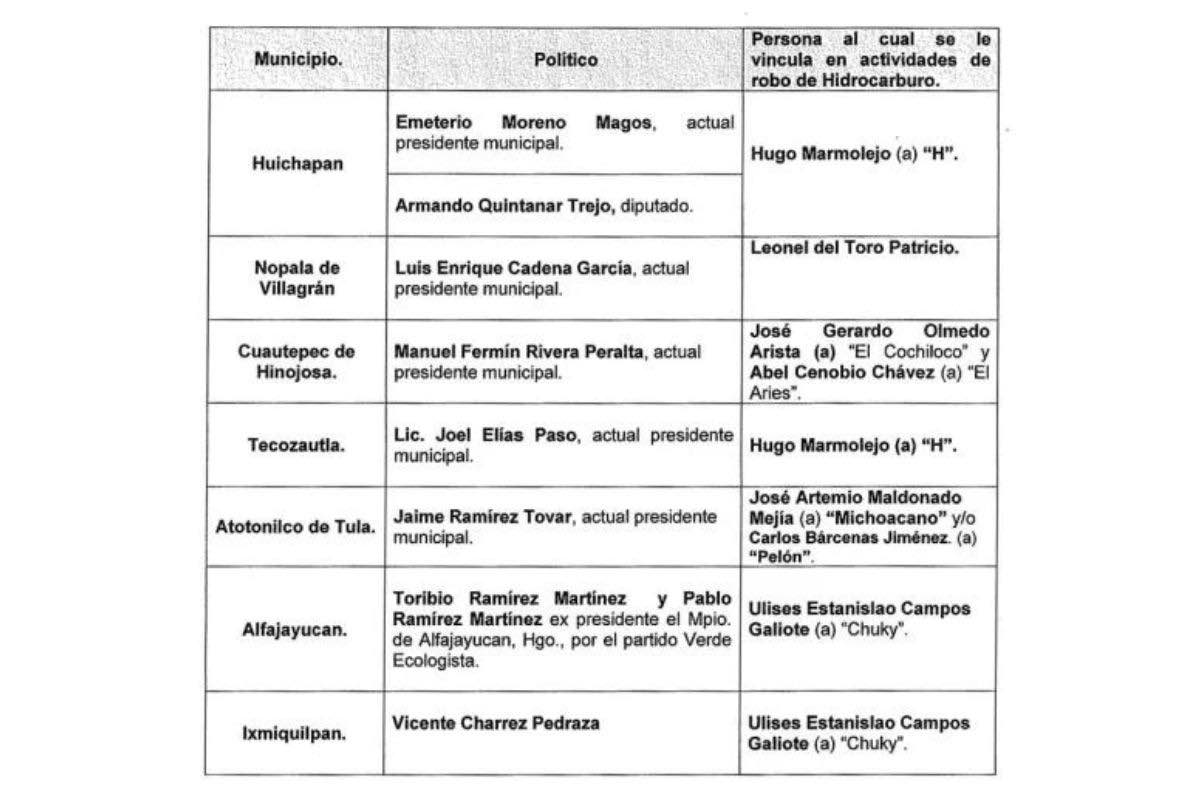 Asimismo, se encuentran el alcalde de Tecozautla, Joel Elías Paso, el presidente municipal de Huichapan, Emeterio Moreno Magos, y el exdiputado local Armando Quintanar Trejo, quienes están vinculados con Hugo Marmolejo, alias “H”, relacionado por la Sedena con el robo de hidrocarburo.