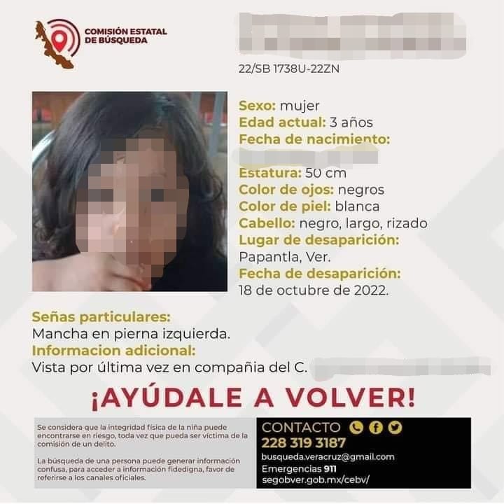 De acuerdo con la ficha que emitió la Comisión Estatal de Búsqueda del Gobierno del estado de Veracruz que inició la Alerta Amber, la niña fue raptada el martes 18 de octubre y la última vez que se le vio iba en compañía de un sujeto de nombre D. B. M.