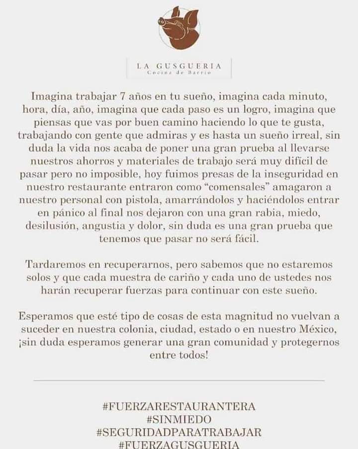 Por otra parte, el restaurante La Gusguería Cocina de Barrio envío un comunicado a sus comensales, en el que muestran su impotencia y rabia de “trabajar día a día… y perder cosas de valor que tal vez no se puedan recuperar”.