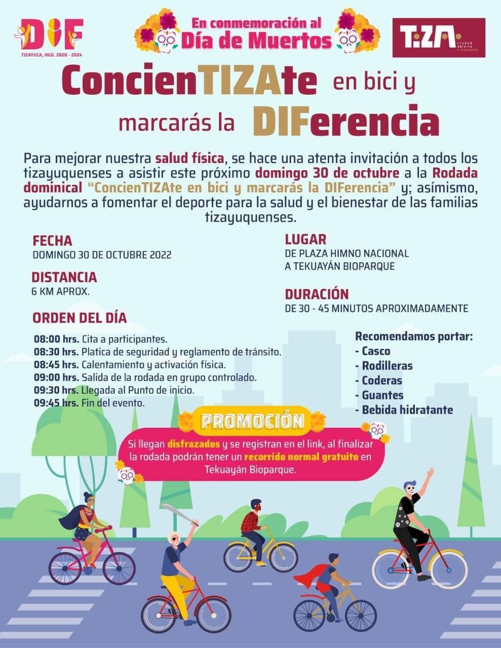 La presidencia municipal y el Sistema Municipal DIF (SMDIF Tizauyca) invitan a las y los tizayuquenses a sumarse al programa “ConcienTIZAte en bici y marcarás la DIFerencia”; quienes se registren tendrán un pase gratuito al Bioparque Tekuayán.