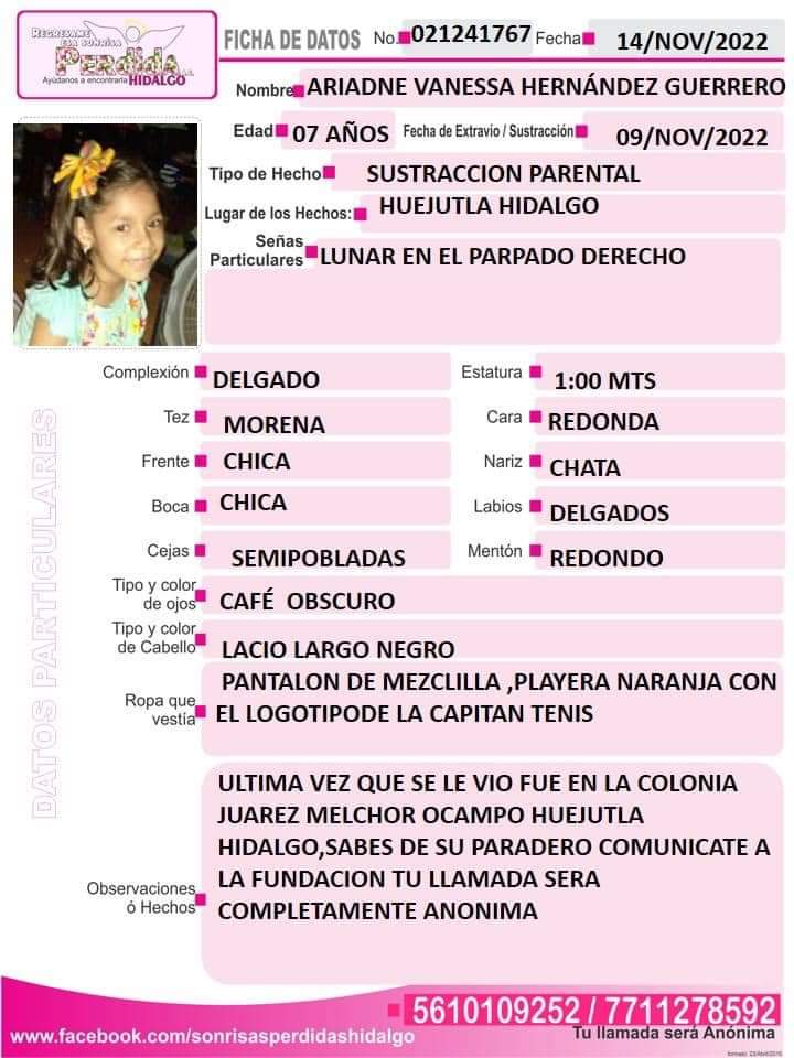 De acuerdo con lo que se da a conocer en fichas que difunde el grupo Sonrisas Perdidas Hidalgo, los niños responden a los nombres de Yovani de Jesús y Ariadne Vanessa, de 11 y 7 años, respectivamente.