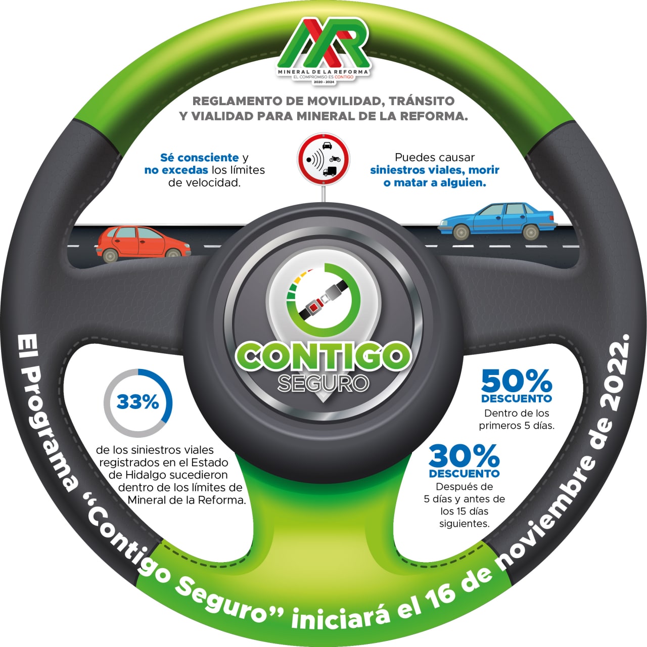 Reafirmando el compromiso con la ciudadanía de salvaguardar la vida de las personas, el presidente municipal, Israel Félix Soto, puso en marcha el Reglamento de Movilidad, Tránsito y Vialidad para Mineral de la Reforma a través del programa “Contigo Seguro” a partir del 16 de noviembre del 2022 con la finalidad de garantizar una movilidad segura para los ciudadanos como lo establece el Plan Municipal de Desarrollo 2020 – 2024 en su eje 5.2.