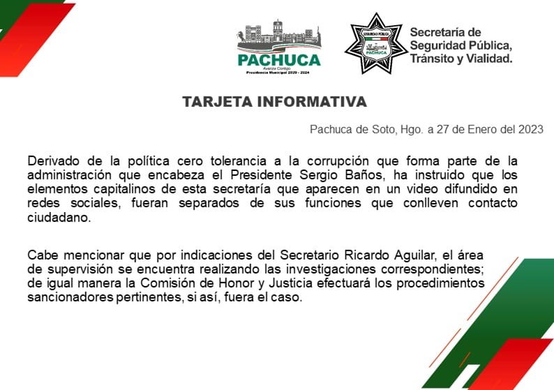 A través de redes sociales, fueron expuestos policías de la capital de Hidalgo, por ser partícipes en posibles actos de corrupción. Ante dichos actos, el municipio de Pachuca informó que dichos oficiales fueron separados de su cargo, así como se llevará a cabo una investigación para dictaminar la sanción correspondiente.